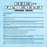 L’Ajuntament de Xàtiva ha obert el termini per a la presentació de candidatures per a cobrir el càrrec de Reina de la Fira d’Agost 2024.